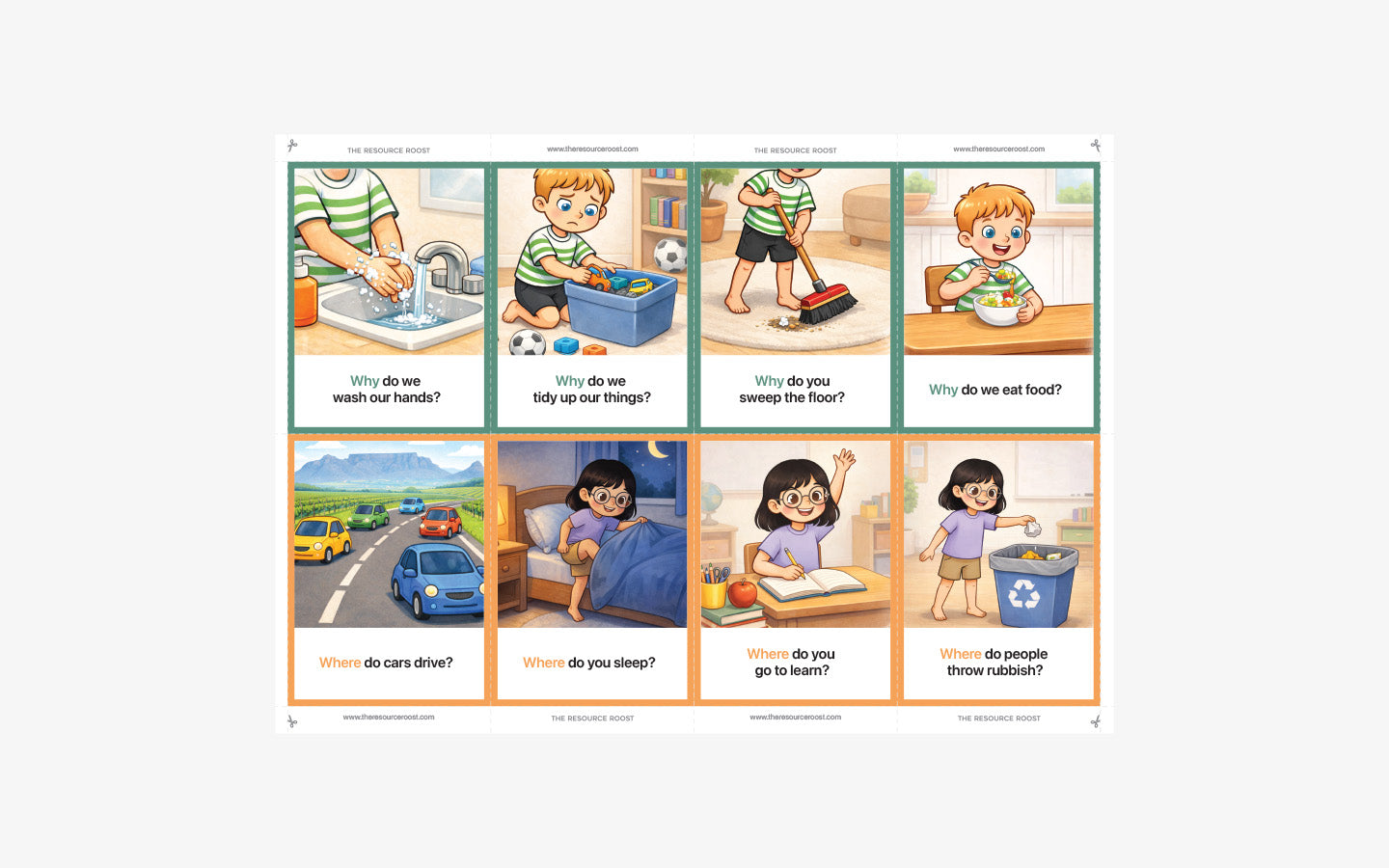 The cards introduce Who, What, Where, and Why questions in a clear, predictable format, helping children practise listening, thinking, and responding without overwhelming language or visuals.